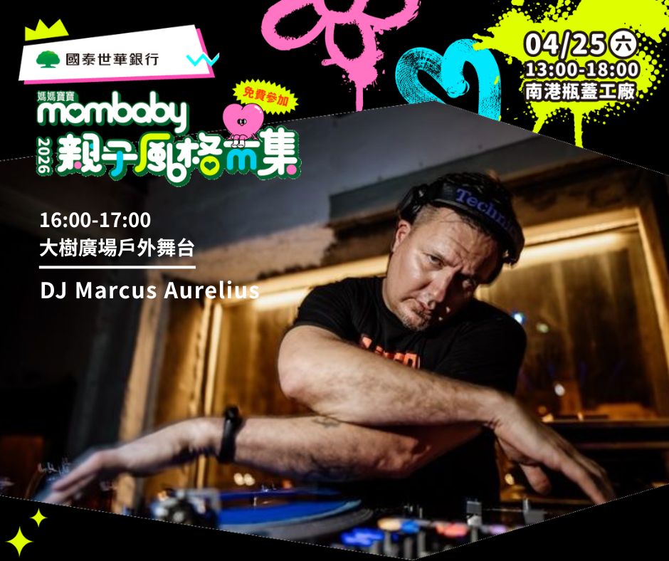 媽媽寶寶特別邀請到知名的 DJ Marcus Aurelius 坐鎮,他將用最專業的音樂品味與節奏感,把兒歌可以變得很時髦,孩子的舞動與家長的歡笑聲交織,讓爸媽在帶娃之餘也能找回靈魂裡的熱血。