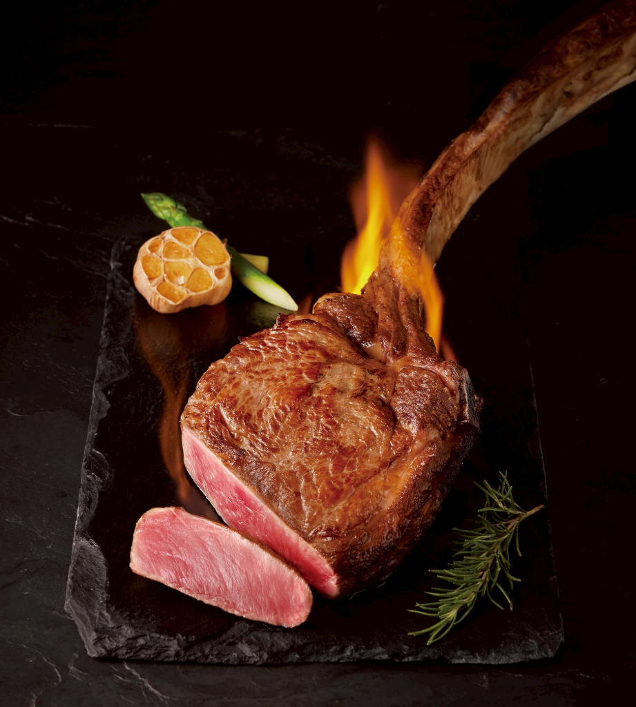 ▲ 「澳洲穀飼厚切戰斧牛排」主餐:外酥內嫩,重達36oz的氣勢份量,歷經高溫炙烤與烈焰儀式展演,是全家人共度「精心時刻」的最佳主角。(圖:王品集團)