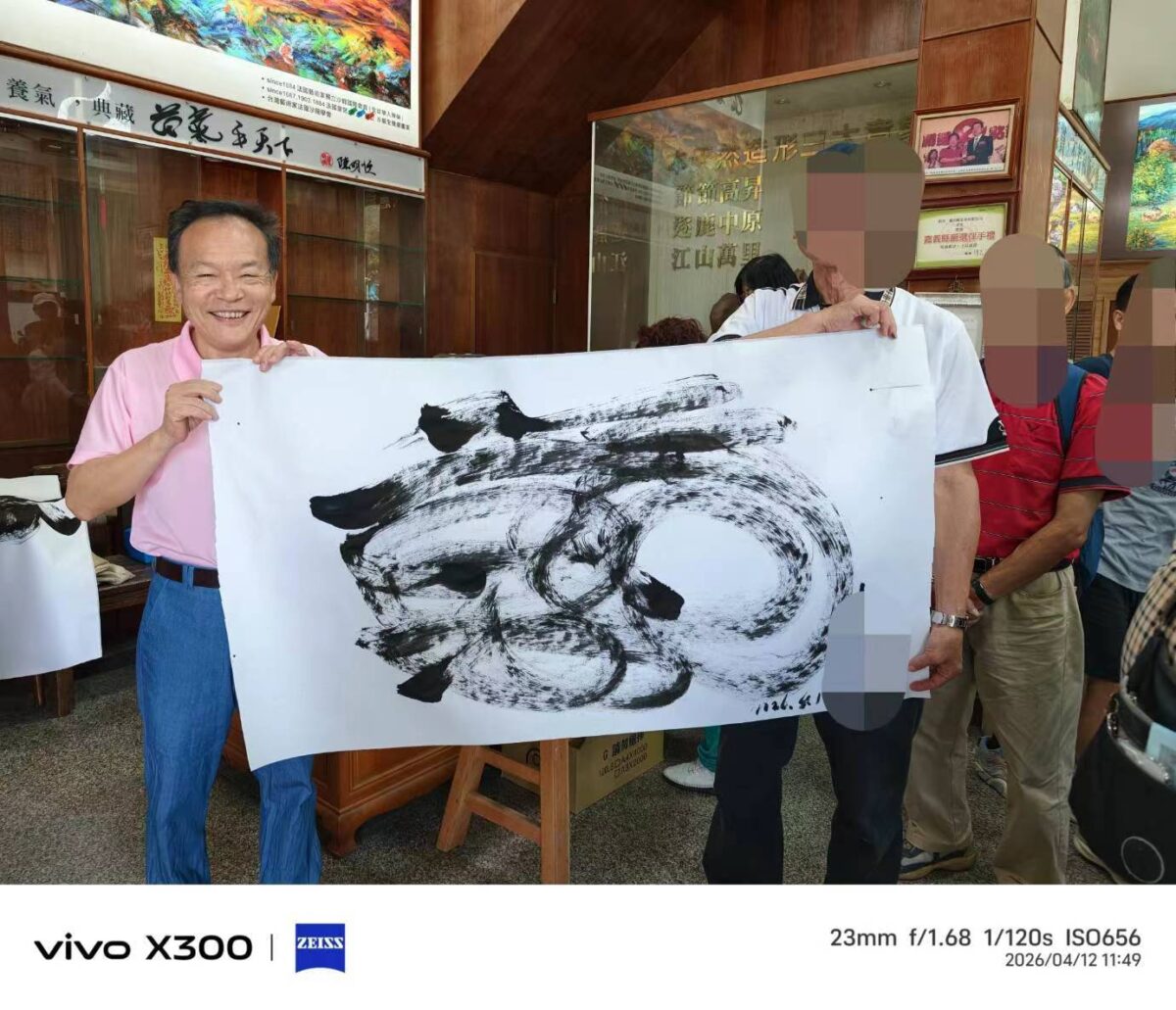 活動現場,陳明順親自揮毫,以大幅宣紙創作巨型龍字。從沾墨到落筆,每一筆皆需高度專注,並考量整體平衡與視覺張力,展現其獨樹一格的筆觸風格。