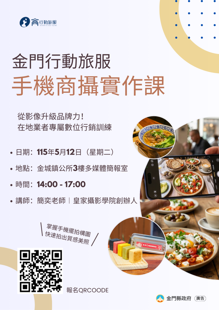 此次攝影教育訓練將於115年5月12日下午2時,假金城鎮公所三樓多媒體簡報室舉行,即日起開放線上報名,名額有限,每店家限1人參與,額滿為止,歡迎金門在地合法觀光業者填寫表單報名,一同掌握智慧觀光趨勢,提升品牌曝光度,共創更多商機。