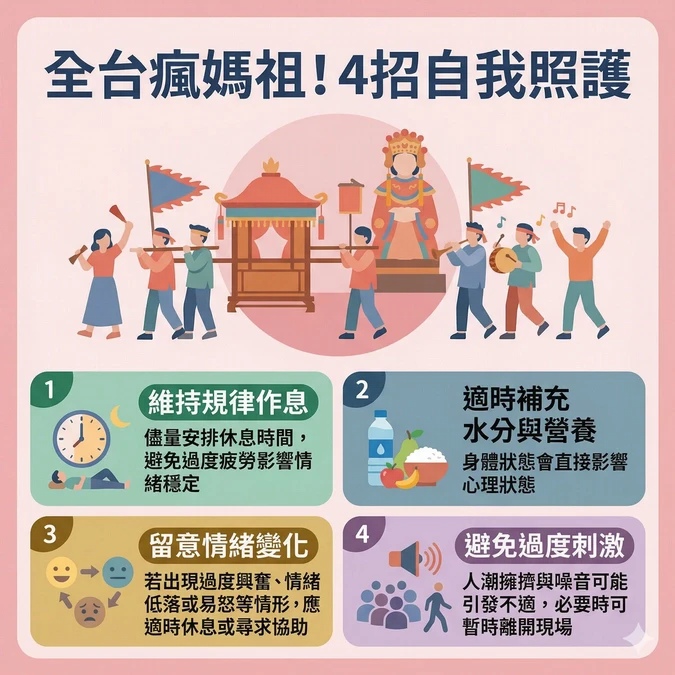 何儀峰叮嚀,參與宗教活動應以「身心和諧」為前提,若本身患有焦慮症、憂鬱症或睡眠障礙等情況,在感受神明慈悲的同時,應特別注意自我照護原則: