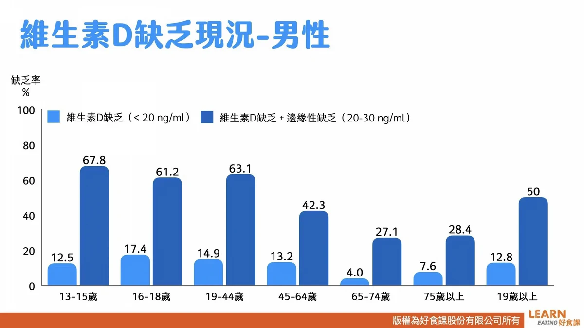 根據國民營養調查,台灣成年男性體內維生素D不足的比例為50%,且有12.8%達到缺乏階段。最嚴重的是19~44歲的族群,不足率達到63%,缺乏率將近5成,顯示台灣男生的維生素D狀況十分不好。