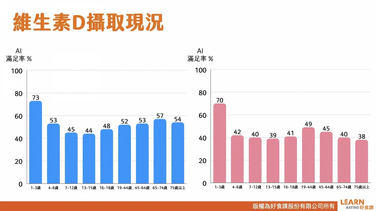 在台灣,無論是性別、年齡,維生素D攝取都嚴重不足!女性的維生素D攝取量,連建議量的一半都不到,男性則稍微好一點,但也是嚴重不足的狀態。
