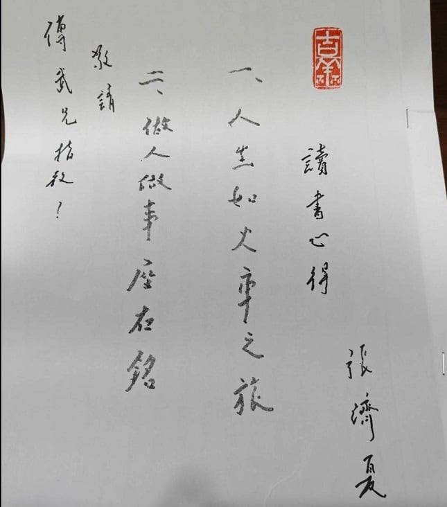 將軍説:「主財人員就是涓滴歸公,一介不取」,他並説出故違法紀,遭致嚴懲究責的實例;其軍旅亦曾悍拒,他人要其將欲撥發單位之經費,聯手合作私吞!為爭取官兵合理待遇與福利猶恐不及,豈能心存不軌,圖謀私利,將軍不恥正色的説;並將閒暇讀書心得,印發予我們,期盼書中自有黃金屋,纔是我們該謀的人生正利與正道!其重點有—人生如火車之旅、做人處事座右銘二十則,無限深情厚澤,關愛之情溢於言表,更在字裡行間;辭別前,贈予我們人手薄片黑巧克力乙盒,盛情難言更動容!