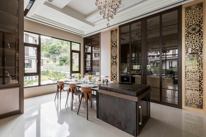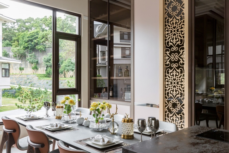 - 奢華餐廚:選用精緻繡面薄石板吧檯搭配珍藏酒櫃與倒吊高腳杯燈飾,勾勒出典雅質感。