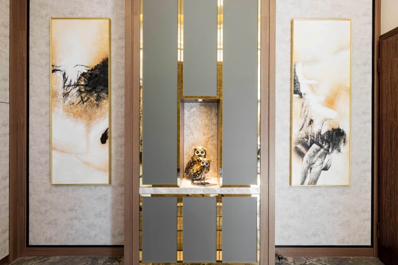 - 端景迎賓:玄關處設置貓頭鷹模型與抽象畫作端景,於鍍鈦邊框的映襯出氣派氛圍。