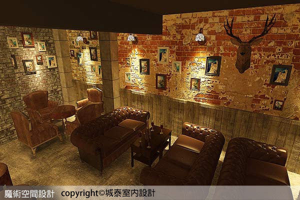 4.斑駁磚牆裝置鹿頭壁飾更添復古味,搭配英美風沙發、吧檯椅凳,壁燈、吊燈等軟裝一次到位,將氣氛帶入時空隧道。