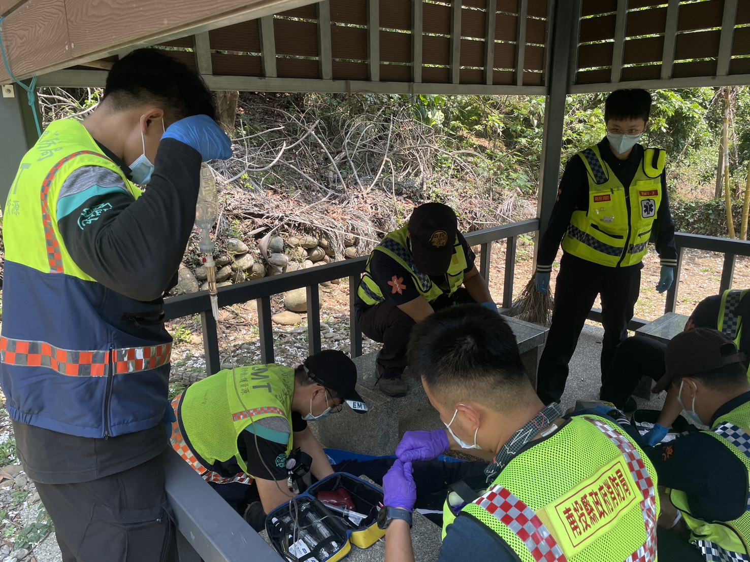 彰化芬園分隊人員抵達時,現場已有南投高級救護技術員許秝豐先行展開急救。參與救援的救護人員形容,現場就像一場完美的「團隊資源管理(TRM)」示範,雖然大家來自不同單位,南投縣許秝豐為現場唯一高級救護技術員,因此先擔任小組長並以「團隊資源管理(TRM)」的概念分配每1位救護技術員任務,例如實施CPR及電擊4次等處置。彰化芬園分隊的高級救護技術員陳冠儒抵達後隨即介入,在與南投縣團隊快速交接後,立刻決定施打骨針接上靜脈輸液,並給予第1劑的強心劑也就是腎上腺素(Epinephrine),患者後續由碧興分隊送醫,並在救護車送醫途中持續急救,終於在患者抵達醫院後,順利恢復自發性呼吸及心跳(ROSC)。