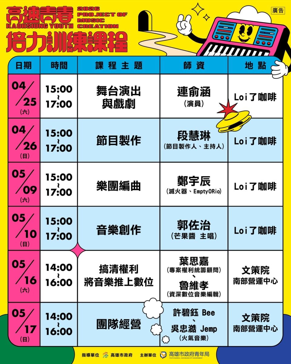 青年局長林楷軒表示,2026「高速青春」由培力課程、職場體驗、音樂製作、前導、展演五大核心項目環環相扣,建構出完整的音樂產業一條龍。率先揭曉的「培力訓練課程」師資陣容強大,期盼深化流行音樂、影視製作與表演藝術的跨領域整合。透過這套機制,我們引導青年從興趣出發,了解產業概況,將原始的創作能量精煉為具接軌市場的量能,成為未來流行文化產業的即戰力。