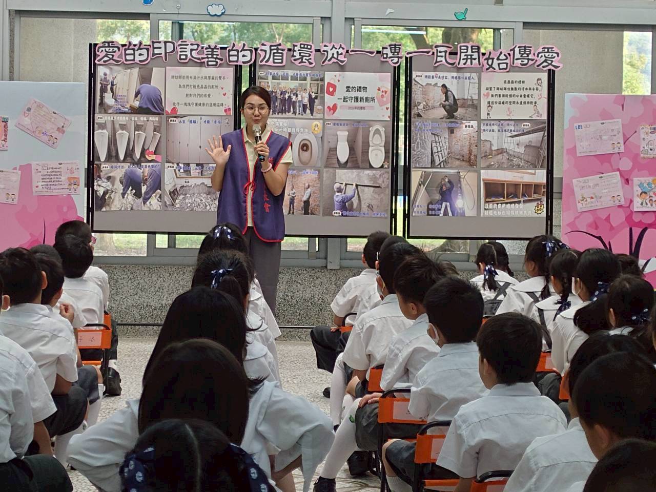 在全體師生熱情倒數聲中,校長、家長會長與志工代表共同拉開門口的「蝴蝶結」,象徵一年級廁所正式啟用。緊接著,全體一年級學生大聲說出:「大愛傳遞,愛護廁所我最行!」