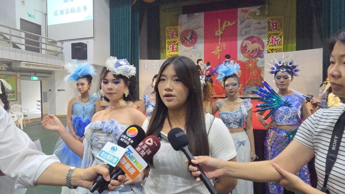 與許艷方同組的洪詩芸表示,創作初期曾遇到瓶頸,後來透過網路觀摩逐漸找到方向,她的作品以馬甲為主體,搭配布料摺疊設計,營造立體蓬鬆效果,並利用使用過的假髮剪碎重製成頭飾,兼具環保與創意。