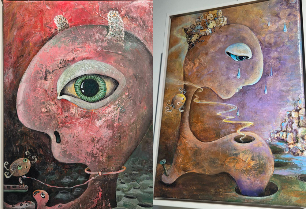 展場作品延續她一貫的視覺語言,火山、眼球、拼圖與海洋等意象彼此滲透,在看似破碎與流動的構圖中,形成穩定卻難以言說的秩序。這些符號並非單純拼貼,而更像是意識層層展開的軌跡,呈現個體從混沌走向自我辨識的過程。畫面中的張力,來自於元素之間既衝突又共存的關係,也讓觀者在觀看過程中不斷游移於理解與感知之間。