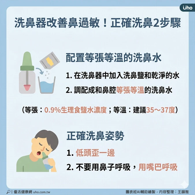 - 調配成和鼻腔等張等溫的洗鼻水(等張:0.9%生理食鹽水濃度;等溫:建議35~37度)。