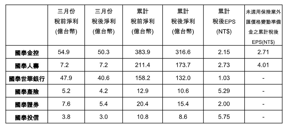 ●國泰人壽 3月稅後淨利7.2億元,累計首季稅後淨利173.7億元。