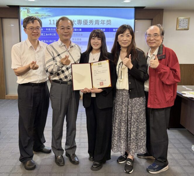 學務處課外活動指導組吳彥鋒組長表示,優秀青年依其表現特色分為「學生自治領導」、「專業競賽表現」及「多元參與與服務」等三大類。環境工程與科學系吳侑庭(明誠高中畢),曾任學生自治會副會長及系學會會長,多次擔任大型活動總召,具備卓越領導與統籌能力;健康事業管理系孫苡葳(明誠高中畢),擔任學生自治會公關部部長,於活動規劃與對外溝通表現優異,兩人皆獲選「學生自治領導」。