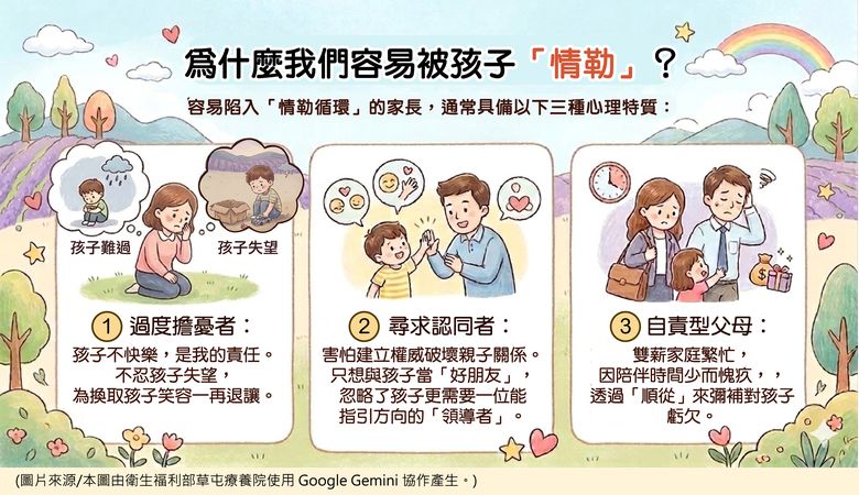 - 過度擔憂者:家長潛意識認為「孩子的快樂是自己的責任」。因不忍見到孩子失望,常為了換取孩子的笑容而一再退讓。