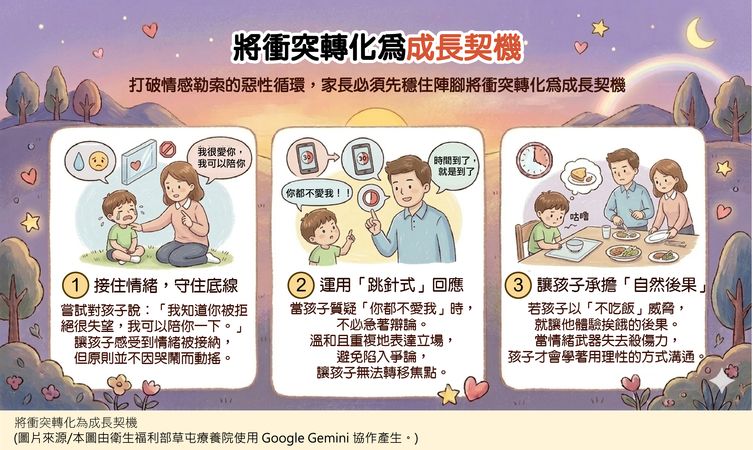 衛生福利部草屯療養院王茹薇社工師指出,這種利用大人的愛與自責心態來達到目的的行為,在心理學上其實是一種「情感勒索」。若要打破這場無形的親子拉鋸戰,家長需要先覺察自己的情緒狀態,並在衝突發生時穩住內心的陣腳。