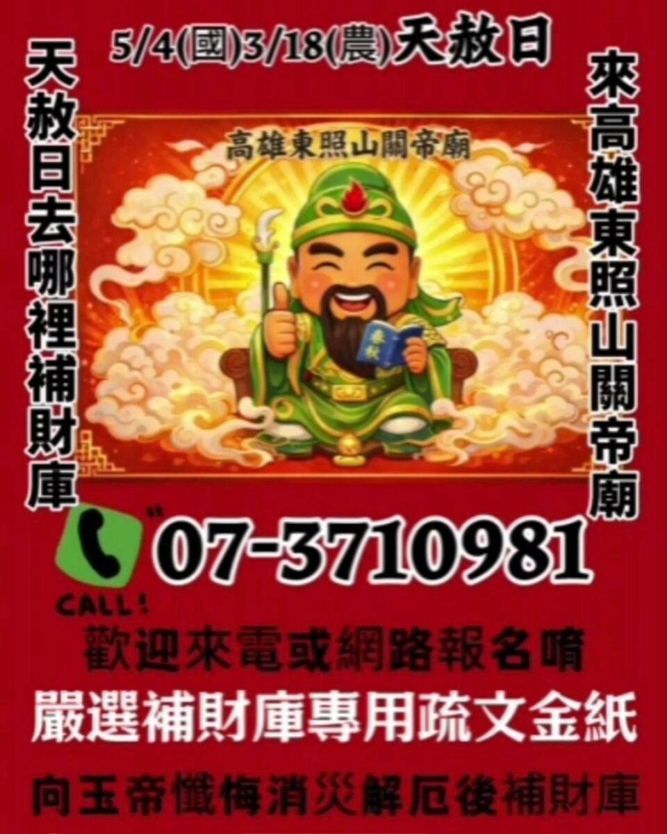 【記者王苡蘋╱高雄報導】年度最受矚目的轉運補財庫盛事進入最後倒數!高雄東照山關帝廟將於國曆5月4日(農曆三月十八日)舉辦「天赦日補財轉運祈福法會」,目前報名已進入最後截止階段,名額所剩不多,廟方緊急呼籲信眾把握最後機會,切勿錯失一年一度的開恩赦罪與補財庫良機。