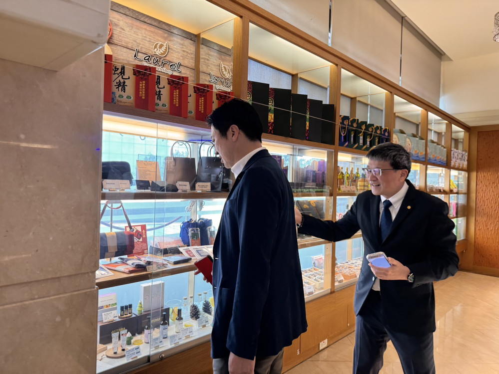 台糖長榮酒店長期深耕藝術美學,將「生活藝術化」的精神融入公共空間。訪問團抵達後,於酒店大廳參觀了台灣當代藝術大師洪易的鋼板烤漆藝術創作。洪易的作品以鮮明用色與東方民俗意象著稱,其富含祝福隱喻的藝術語彙獲得訪團高度讚譽。現場同步展售來自日本職人技術製作的「宮崎和牛皮件」,這項結合日本頂級產業資源與地方價值的展示,成為台日產業接軌的重要象徵。