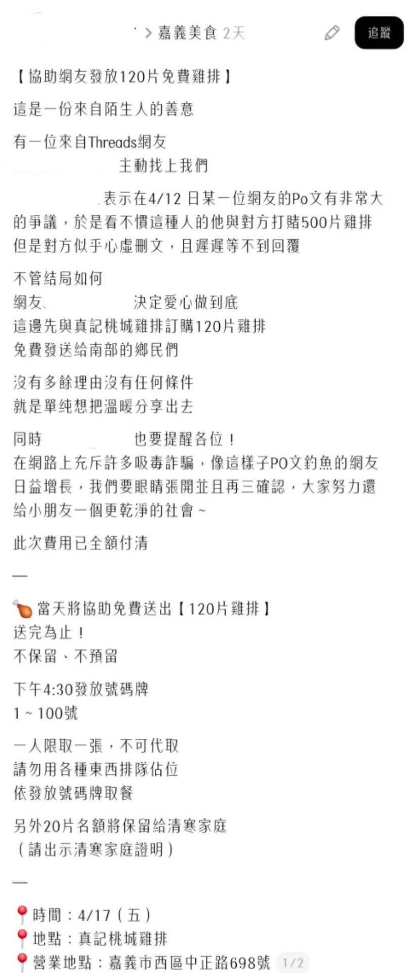 發起對賭的網友決定將這份正義感轉化為公益,免費雞排發放數量達 120 片