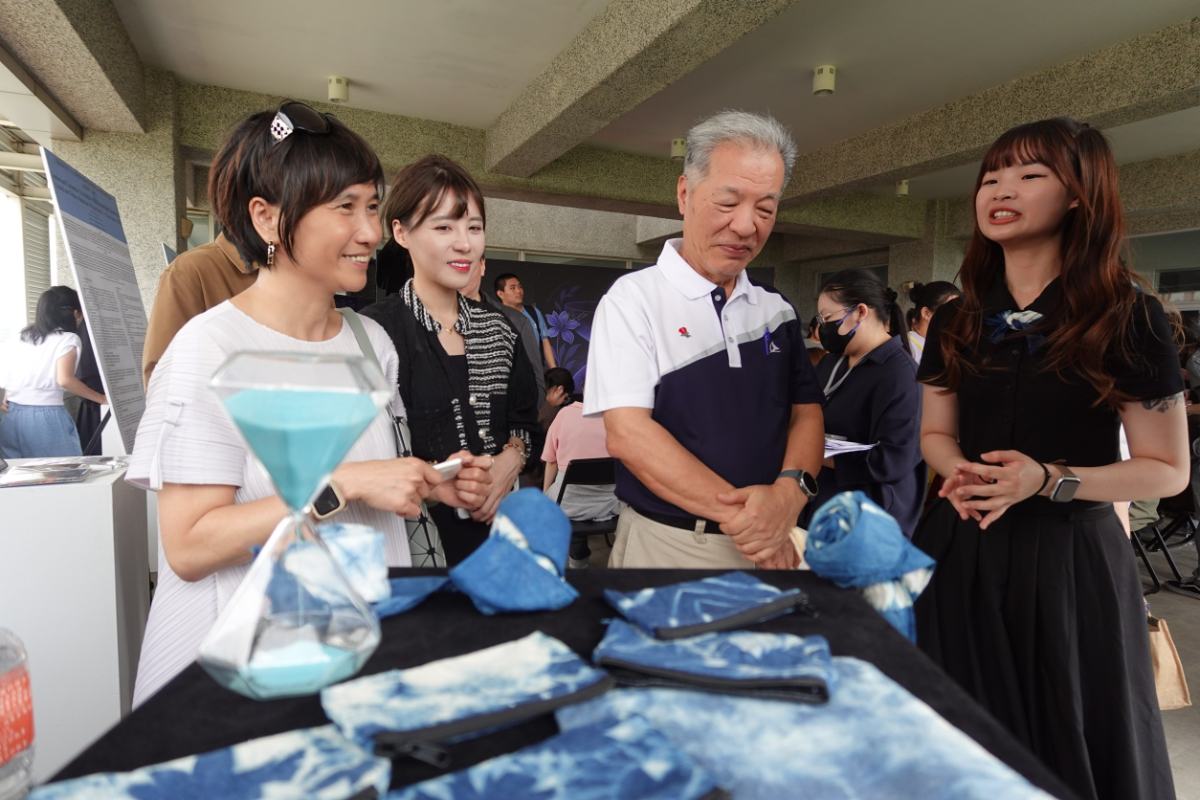 ▲董事長朱元祥及副校長陳碧雲於《藍圖》展示區中仔細聆聽,作品以「客家藍染文化」為主軸,舉辦藍染手作坊,透過實作傳承技藝(記憶)。