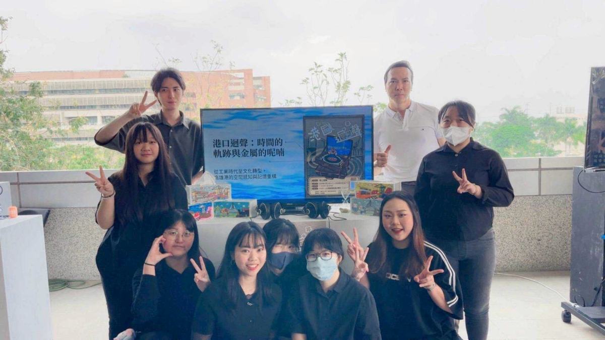 ▲《港口迴聲》製作團隊及指導老師藝管系洪寅洲教授(右後一),作品以「高雄港都歷史」為主軸,用聲音、影像去講一段關於地方的故事。