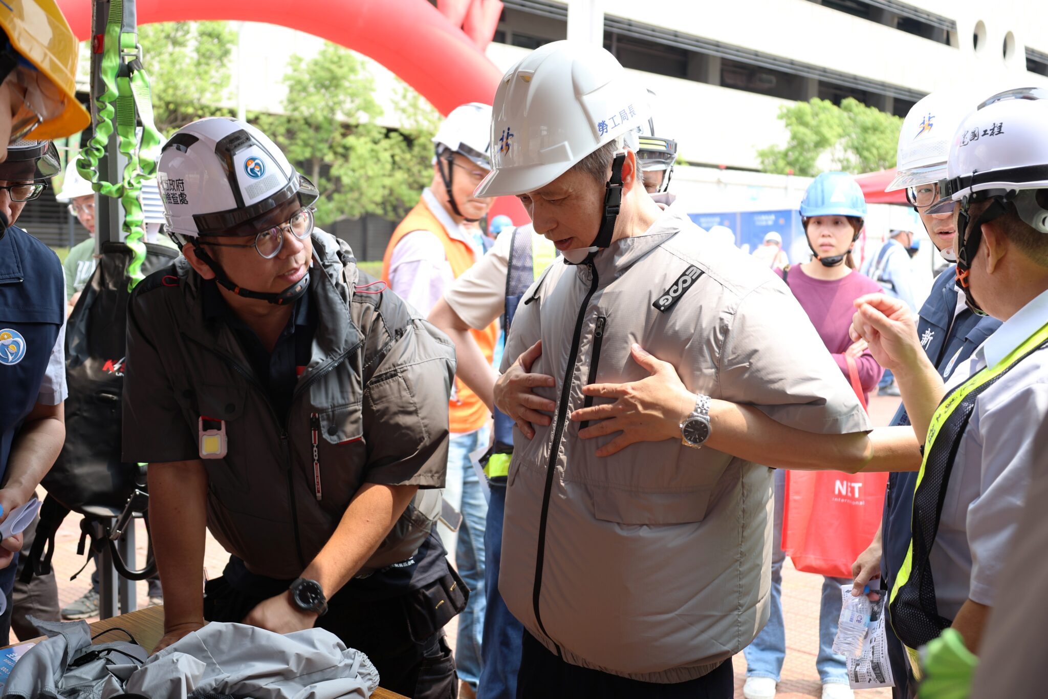 這次觀摩活動現場並有各式降溫設備廠商攤位,展示目前最新的多元發展趨勢;陳瑞嘉陳和林立青對於利用太陽能電池的水霧遮陽模組非常感興趣,頻頻詢問構造細節;另廠商也展示最長可達三十小時的風扇衣,具備防潑水、抗UV、隔熱材質,陳瑞嘉也現場試穿感受降溫效果。