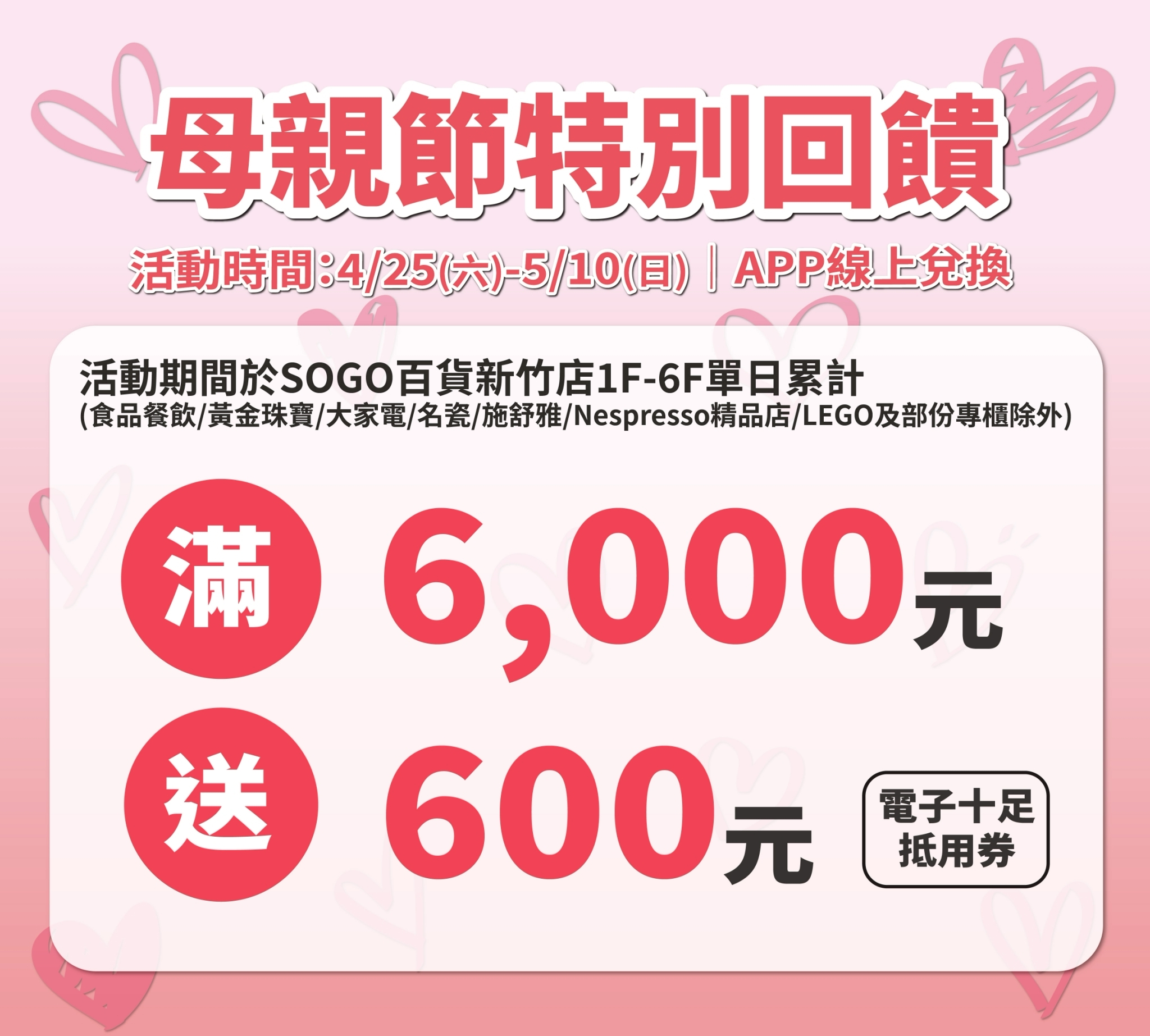 新竹SOGO店長祝平政表示,今年母親節檔期已不只是節慶消費,而是上半年家庭支出規劃的重要節點。新竹SOGO啟動多重回饋,讓顧客可以在價格相對穩定的時期完成關鍵採購,推出扣快樂購點數200點換100元購物金,每人可換5張,限量1萬張,4月17日11點SOGO APP線上開搶;百貨服飾單日累計滿6,000元送600元、大家電單筆滿10,000元送1,000元、珠寶/名瓷/施舒雅/冷氣空調單筆滿10,000元送500元。