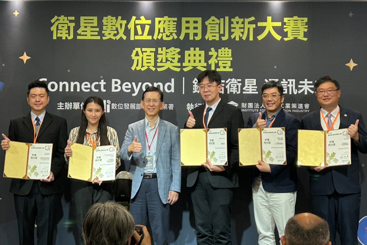 - ▲勇奪數發部「2025 衛星數位應用創新大賽」特別獎,宜大陳懷恩教授帶領「老天有眼」團隊留影。