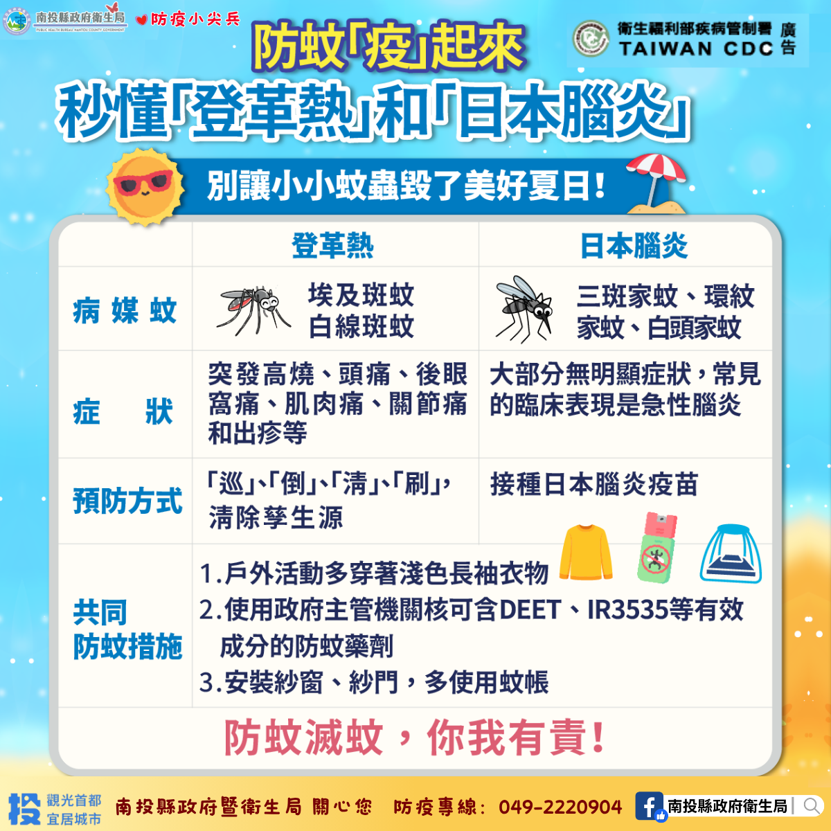 衛生局長陳南松呼籲,日本腦炎與登革熱同樣具社區傳播風險,民眾除關注登革熱疫情,也須留意其他病媒蚊預防措施。預防日本腦炎除注意避開高風險環境、使用衣物藥物防蚊,最有效的方法為接種疫苗,民眾應按時帶家中滿15個月以上的幼兒至各地衛生所或合約院所接種。住家或活動地鄰近豬舍、水稻田等高風險環境的民眾應加強防蚊,如自覺有感染風險的成人,可至縣內旅遊醫學門診(衛生福利部南投醫院、埔基醫療財團法人埔里基督教醫院)評估自費接種日本腦炎疫苗,避免因感染衍生嚴重後遺症。有關防疫相關資訊請參閱疾管署全球資訊網(https://ntshb.tw/hc03TerN6),亦可撥打免付費防疫專線1922或撥打本縣防疫專線049-2220904洽詢。(照片記者 謝雅情翻攝)
