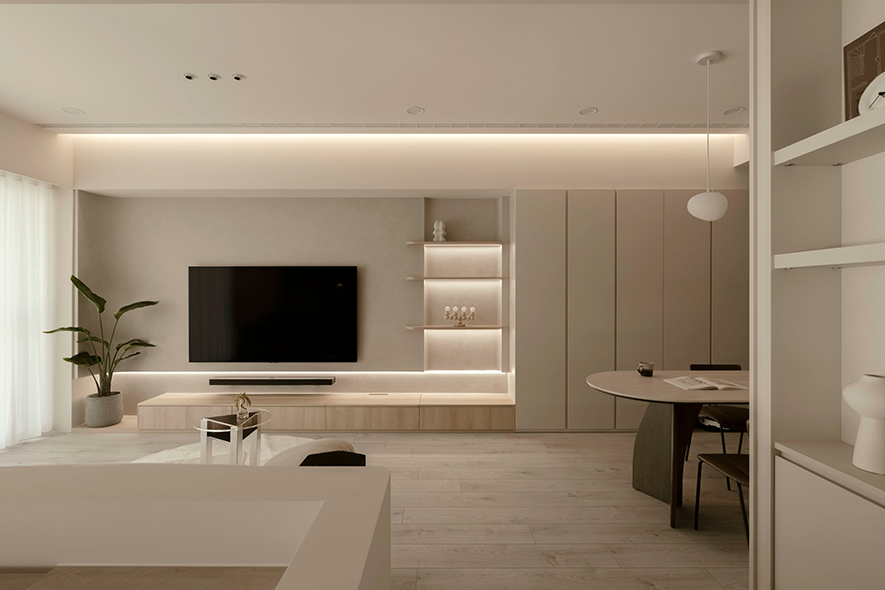 步入客廳,雙層電視牆延續餐區櫃體色調,自展示層架、主牆至窗畔勾起的弧面,齊整無間斷的樸暖畫面也勾起、滲入觀者的心,雜亂思緒得以在此純淨間沉澱,且多處量體下緣傾瀉的線性明光,不僅偕同紗簾淌入的戶外天光,襯托主牆特殊塗料的纖細質感,更強化懸浮視覺效果,實現親和宜人、藝韻滿盈的舒適生活場所。