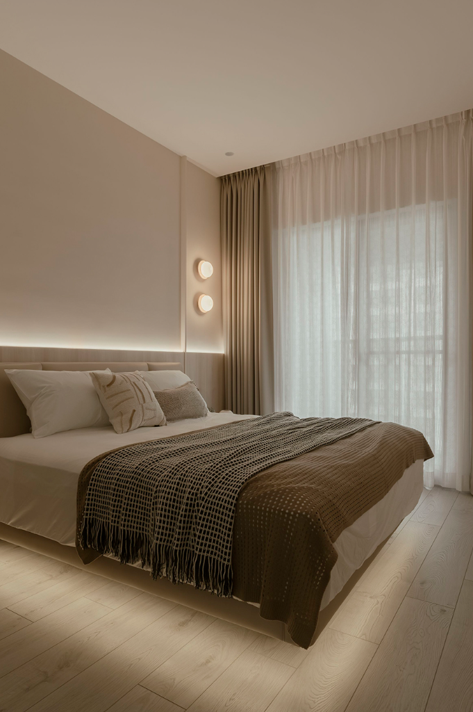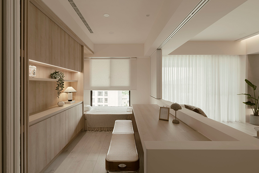 呼應公領域的淺雅語彙,主臥舖陳柔米、淡木基底,輔以床架下、床背板後方特別藏設的間接燈光,令漫流光影染出色階間的暖煦溫度,佐搭床頭上下並列的兩盞圓潤壁燈,如明月緩緩攀升,營造詩意繚繞的寫意氛圍。整體在素樸簡約中融入溫情,使臥房回歸可沉心舒展的休憩空間。