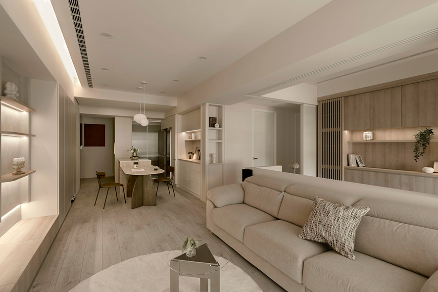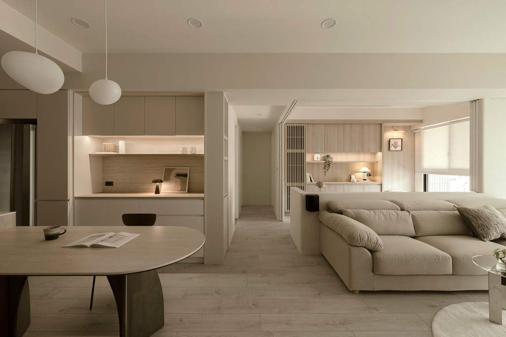 達譽設計團隊 為盡室奶油色交織樸暖木紋,其潛藏的發想已然跳脫「設計」概念,而是讓暖色底蘊轉作日常中的美化濾鏡,柔潤每日遇到的銳角尖刺;人造燈照及自然光線的微光流映間,僅是身處此處,便能徹底療癒倦意,將身心安放在這片承載時間流動和情感匯集的溫柔場域,把生活調節為安定踏實、專屬居者的自在步調。