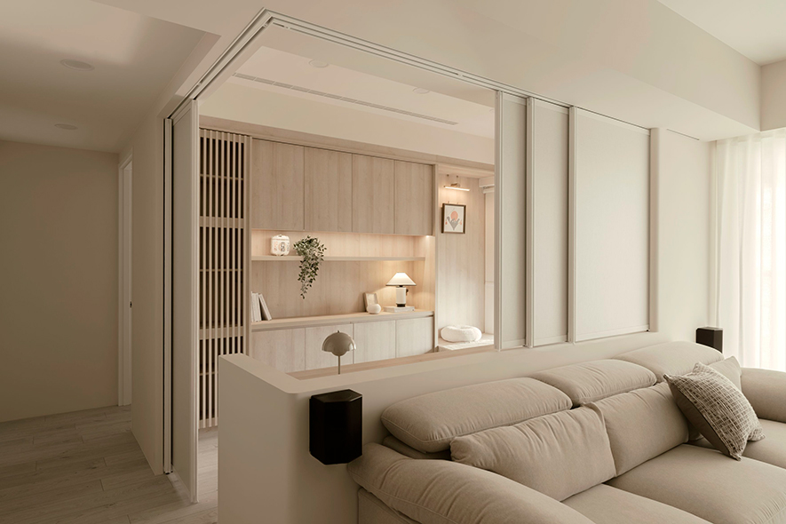 客廳沙發後方設半高牆面分劃多功能區,並於近窗側設置活動隔屏,可配合滑門將此區獨立一室,賦予使用者閱讀、憩息時所需的寧謐隱私環境;而內部設計整片輕淺木韻,和局部匯入的格柵造型、精心選置的古樸老藤椅及和風小物,醞釀出日系醇粹的典雅風範,加之臨窗臥榻發散慵懶閑情,共築一方假日休閒的最佳角落。