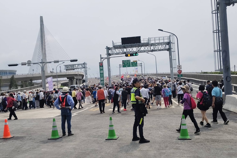 新北市警局表示,今天的活動由淡水、八里區公所等,共同主辦「淡水八里橋見未來」,邀集在地居民約萬餘人登橋參訪,作為淡江大橋通車系列活動首發場次,象徵通車前序曲正式展開,具高度指標意義。