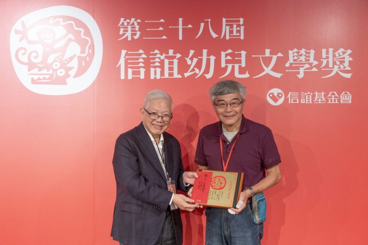 ▲信誼基金會共同創辦人何壽川頒發兒童文學佳作予70歲的退休教授蔡澤民。