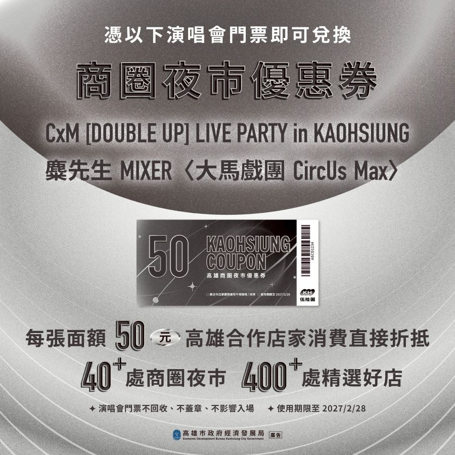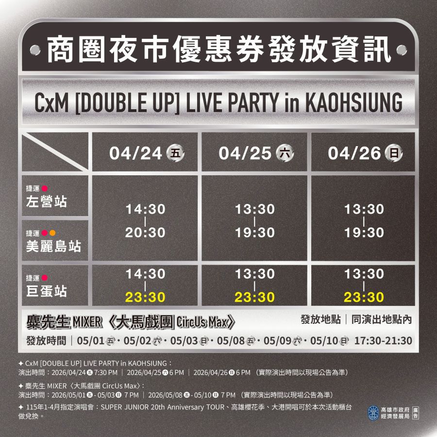 經發局補充,「2026商圈夜市優惠券」可用至明(2027)年2月28日,包括4月的CxM [DOUBLE UP] LIVE PARTY in KAOHSIUNG、5月的麋先生〈大馬戲團CircUs Max〉以及之前1-3月間舉辦的7-ELEVEN高雄櫻花季、2026大港開唱、SUPER JUNIOR〈SUPER SHOW 10〉等票根,都可在本次指定捷運站或活動現場兌換。詳細資訊請留意商圈夜市優惠券官網(https://www.khafterparty.tw/)或經發局粉絲團及IG(@edbkh)。(圖/記者王雯玲翻攝)