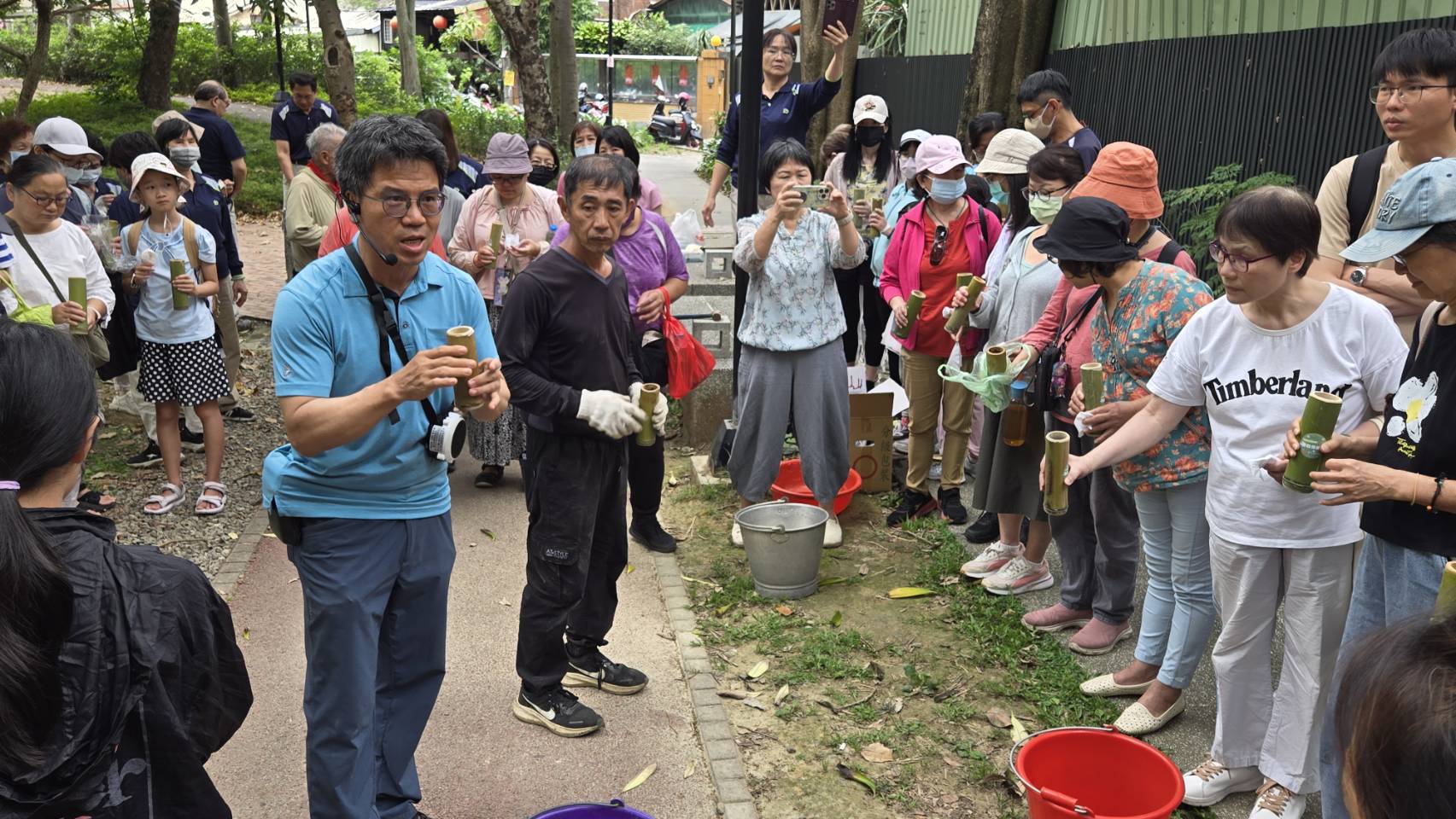 【民眾新聞網方健龍新竹報導】新竹長和宮辦理2026春日青梅季系列活動之「共築美樹影」,今(18)日下午於長和公園登場,繼4/3「青梅醋」手作體驗後,這次以護梅樹惜梅枝為主軸,由專業團隊示範樹木剪養護。活動吸引150位市民親子報名,參與者以親手製作的竹筒有機酵素為梅樹施肥,並利用修樹剪下來的枝條,進行大自然藝術創作。長和宮主委楊金土感謝大家走入公園,參與一場關於「土地、時間與循環」的感官盛宴。