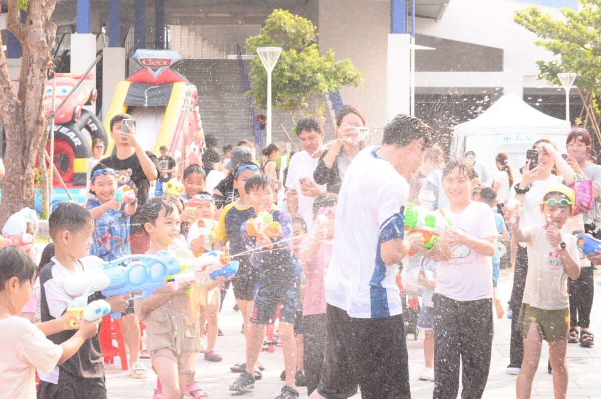 活動現場設置水池與水槍補給站,大小朋友分隊對戰、盡情噴灑,許多家長更親自上陣,與孩子一起投入「水戰」,歡笑聲此起彼落。此外,現場也規劃闖關遊戲與氣墊設施,讓孩子們從早玩到晚、樂不思蜀。