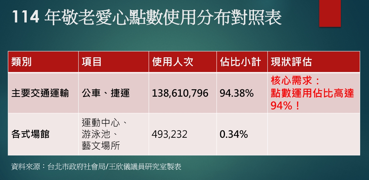另針對掃碼搭車使用率極低問題,社會局回覆因「71處場館缺乏掃碼設備」導致推動困難,王欣儀現場拿出數據打臉。長輩敬老點數有 94% 都用在搭車,運動中心或藝文場館的使用率僅有0.3%,怒轟「九成以上的交通需求設備早就建置好了,社會局卻拿不到 1% 的場館設備沒到位來推託不開放乘車碼扣點,簡直是行政怠惰!」