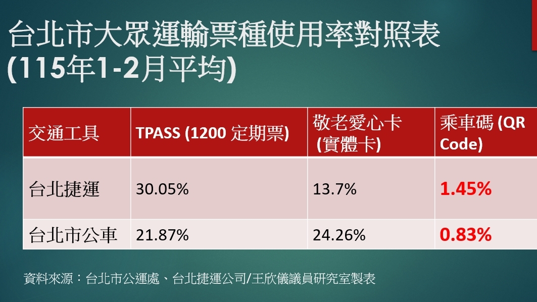 【民眾網編輯方笙楠臺北報導】臺北市議員王欣儀於民政部門質詢時指出,市府大力推動手機掃「乘車碼」搭車,結果因功能缺陷,竟然將佔運量最大宗的TPASS通勤族與使用敬老愛心卡民眾完全排除在外!導致目前乘車碼使用率低得離譜,公車僅 0.83%、捷運僅1.45%,成效極其慘澹!