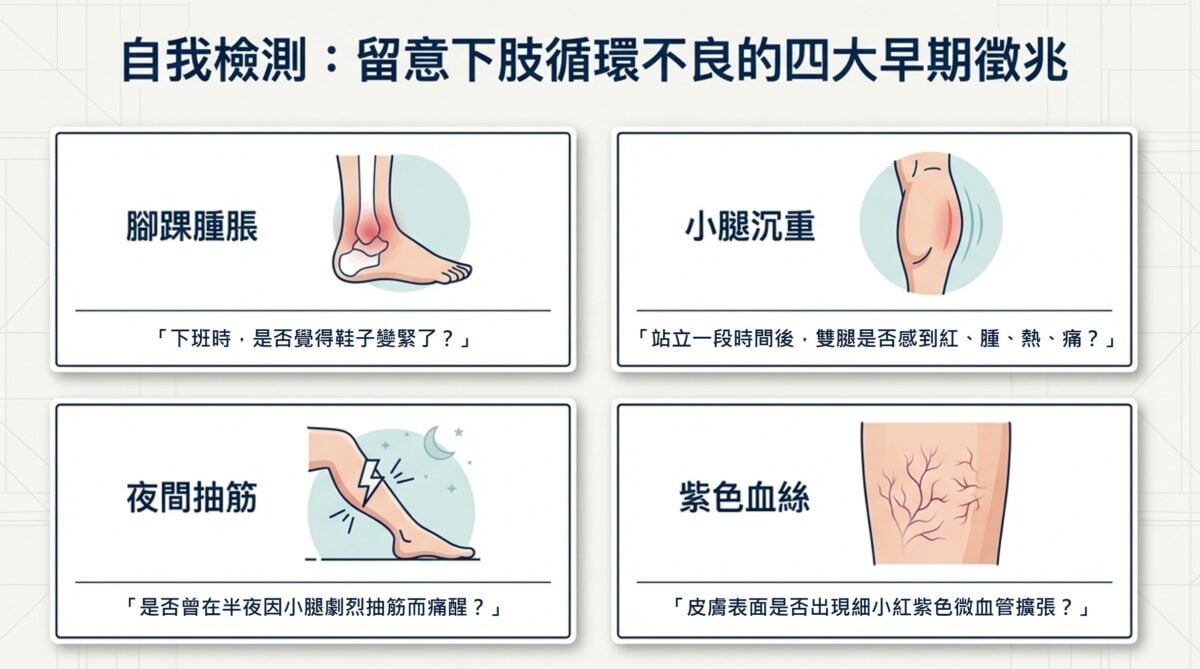 林主任指出,靜脈血液要從腳部逆著地心引力回流到心臟,必須依靠被稱為「第二顆心臟」的小腿肌肉收縮,以及如同眾多小門般的靜脈瓣膜防止血液逆流。當久坐、久站、體重過重或抽菸等因素導致瓣膜變弱或肌力不足時,血液便容易淤積在腿部。許多病患在初期往往忽略求救訊號,像是下班後鞋子變緊、小腿沉重、晚上容易抽筋,或是皮膚出現細小的紅紫色血絲。若問題持續惡化,不僅可能演變成靜脈曲張與栓塞,嚴重者甚至會發生破裂大出血、下肢皮膚變黑變硬,或因傷口久不癒合引發蜂窩性組織炎。