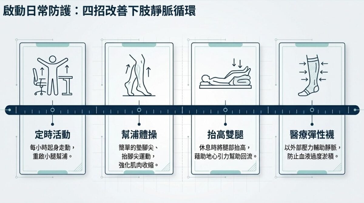 ▲林主任建議日常防護4 招改善下肢靜脈循環問題。