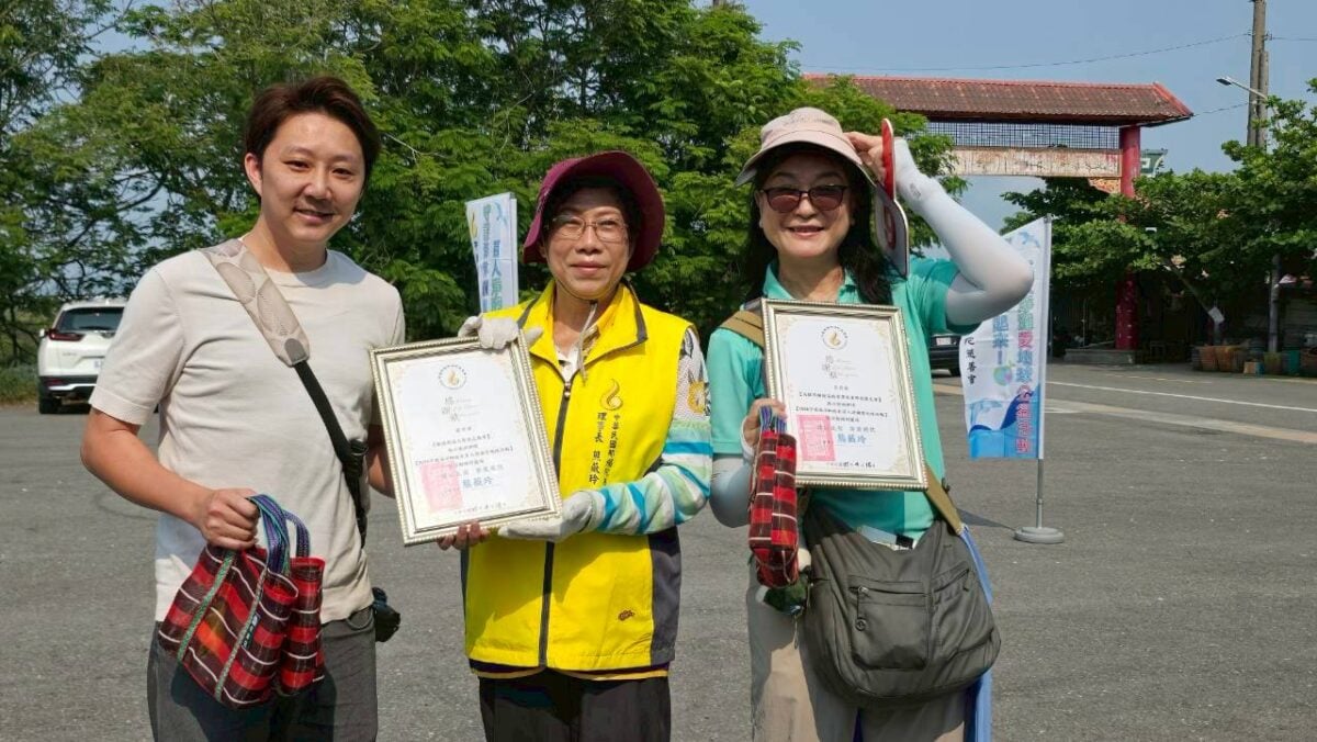 ▲中華民國那爛陀慈善會熊薇玲理事長(中)致贈感謝狀予樹德科大校友總會陳岳群榮譽理事長(左)及樹德家商校友會陳亞屏副理事長(右),表達對各單位共同投入淨灘行動的肯定與感謝。