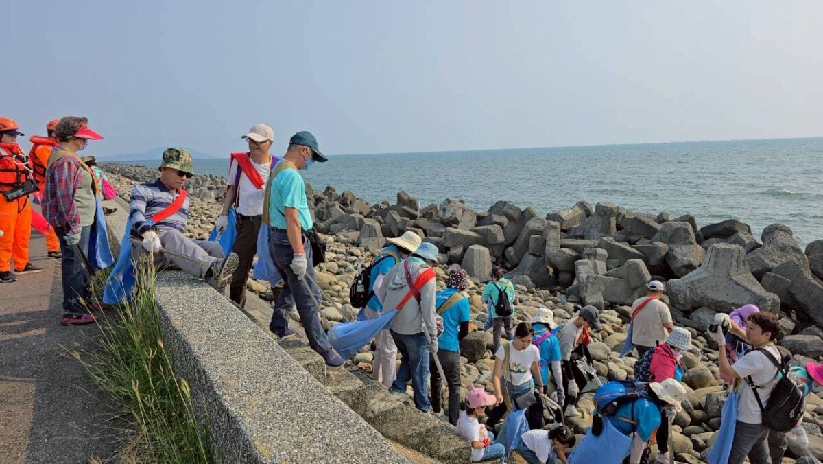 ▲來自6324高屏區同學聯誼會、福山社區發展協會等單位志工沿海岸線分組前進,跨越消波塊撿拾垃圾,展現多元力量共同投入海洋保育的行動力。