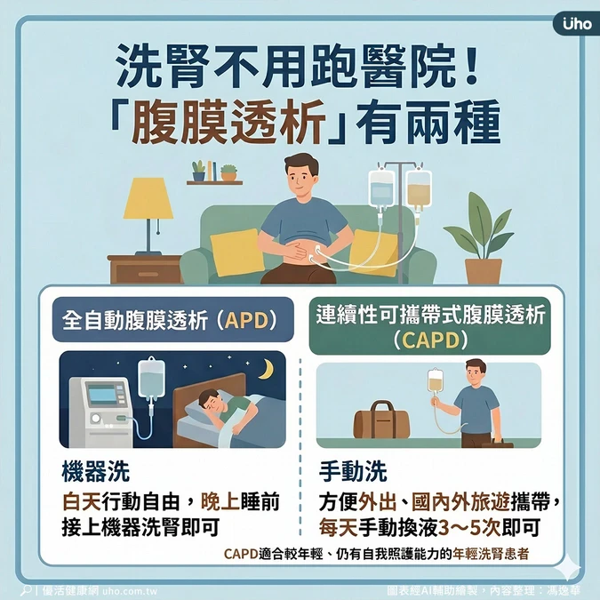亞東醫院腎臟內科醫師徐愷翔表示,腹膜透析目前可分為全自動腹膜透析(APD)機器洗、連續性可攜帶式腹膜透析(CAPD)手動洗兩種。前者白天行動自由,晚上睡前接上機器洗腎即可;後者則方便外出、國內外旅遊攜帶,每天手動換液3~5次即可,適合較年輕、仍有自我照護能力的年輕洗腎患者,可以不用在家、在醫院,也能進行洗腎。
