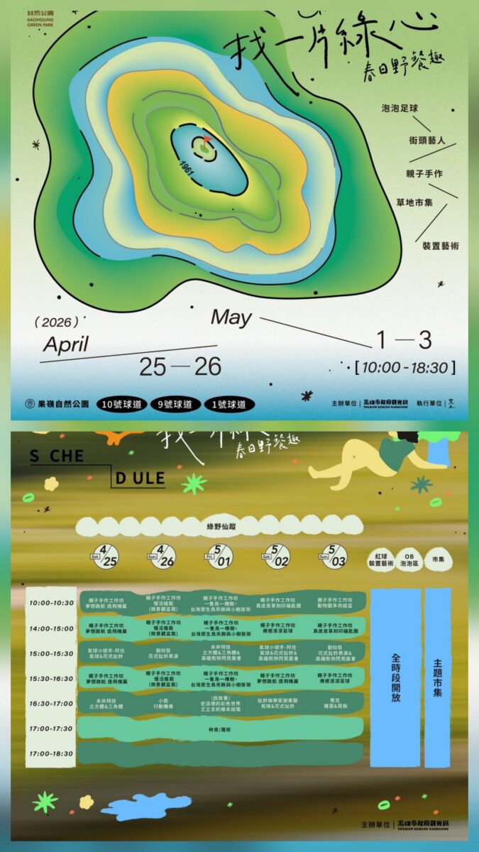 高閔琳說明,為增添視覺亮點,特別於第1、9、10號球道設置大型紅球裝置藝術「紅咚咚」,預計成為最新熱門打卡景點;10號球道則規劃OB泡泡體驗區,讓大小朋友穿上泡泡裝,在草地上盡情翻滾、釋放壓力。下午安排魔術、氣球、雜耍及說故事等精彩街藝演出,其中5月1日由王立言帶來連假限定的繪本說唱《史派德的彩色世界》;5月1日至3日三天連假還有深受小朋友喜愛的「高雄熊快閃見面會」,陪伴大小朋友共度歡樂時光。