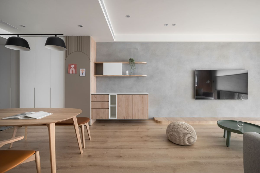 在空間設計上,可採取「一主二輔」的配色法:以奶油白為主色,打造明亮基底;暖灰作為輔助色,增加深度與層次;木紋色作為點綴色,提升溫潤感與自然氣息。這種搭配方式,既能保持空間的低調優雅,又能融入日常生活中的實用性。
