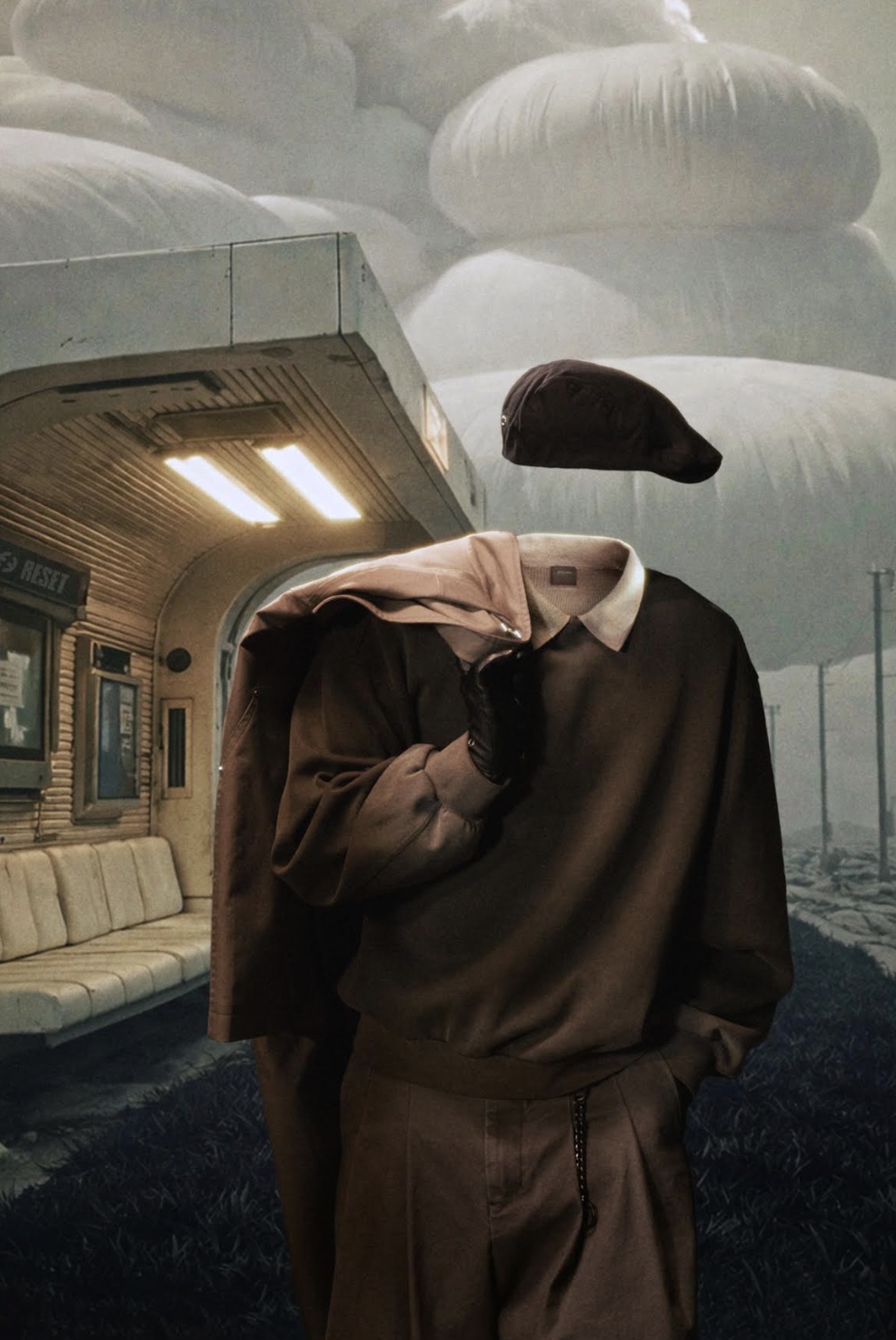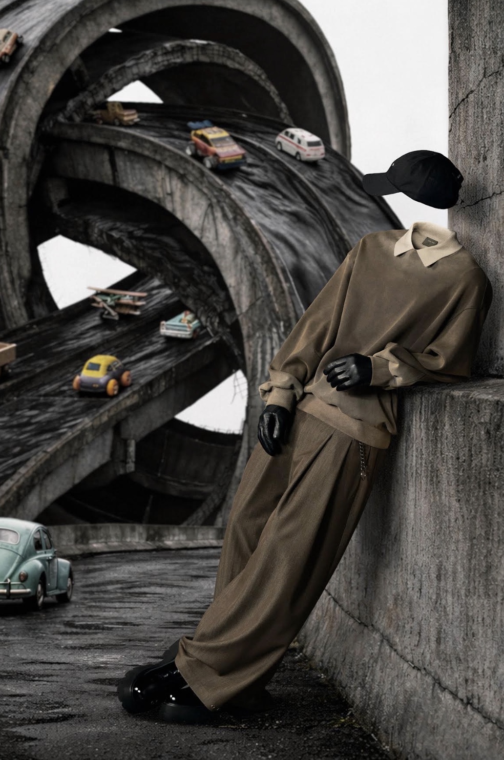 在視覺表達上,”RESET” 以一組被刻意稀釋的中性色調作為整體根基。煙灰色、砂石色、深苔色、深褐色、灰褐色與卡其色構成一套接近自然的色彩系統。低飽和度與灰階傾向共融,使顏色從”表達”轉化為一種基礎,成為承載結構與材質的背景。