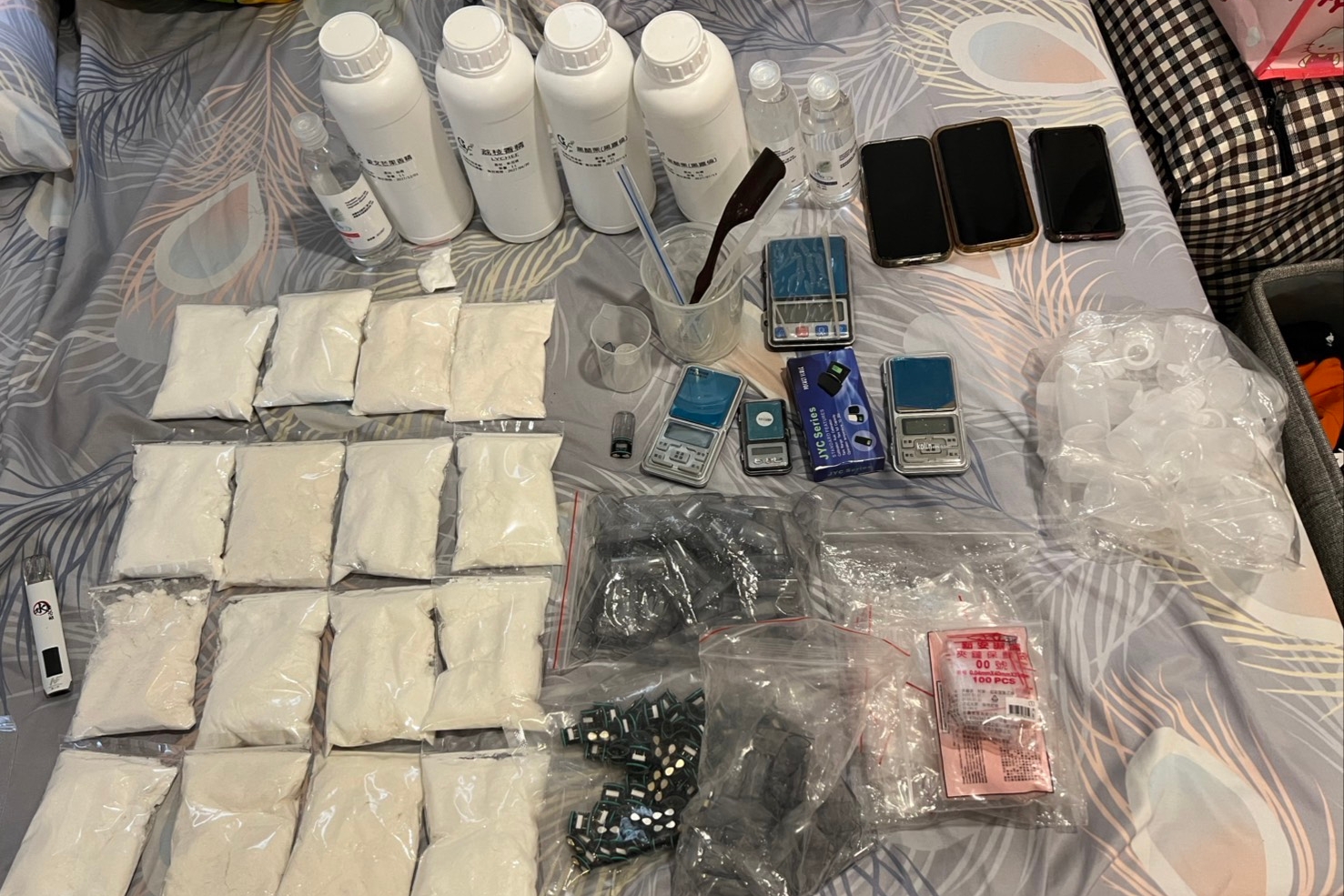 本次行動警方於其中一處據點查獲依托咪酯大型分裝場,現場起出大量毒品原料、分裝袋、電子磅秤及相關工具,初步估算毒品市值逾800萬元,警方研判該集團除涉及搶奪案件外,亦從事毒品分裝與販售,形成複合式犯罪結構,對社會治安造成嚴重威脅,全案訊後依刑法搶奪罪、詐欺罪、組織犯罪防制條例及毒品危害防制條例等罪嫌,移送臺灣士林地方檢察署偵辦,並持續向上溯源,追查幕後主嫌及毒品來源,擴大偵辦中。